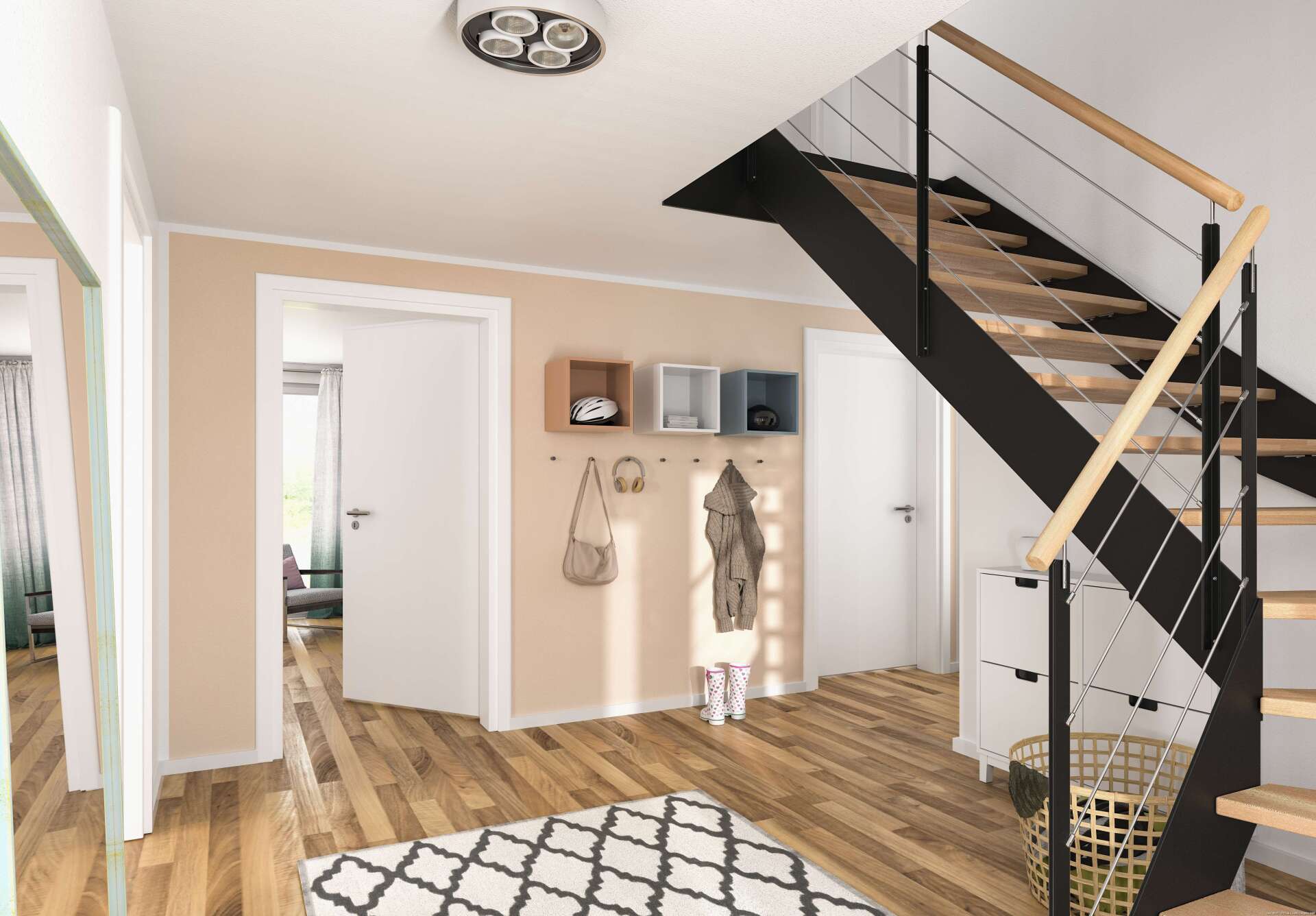 Auch das Obergeschoss zeigt sich im gradlinigen Baustil des Hauses. Hier finden Sie drei Zimmer, die Sie nach Ihren Vorstellungen als Schlaf-, Kinder- oder Gästezimmer nutzen können. Große Fenster lassen auch hier viel Tageslicht hineinströmen. Die Ankleide im Schlafzimmer bietet viel Stauraum.