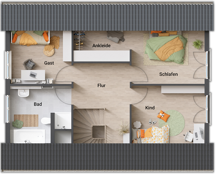 Im Dachgeschoss erwartet Sie ein großes Schlafzimmer mit eigener Ankleide. Auch die beiden weiteren Zimmer garantieren ihren Bewohnern viel Freiraum. Das Bodensee 129 ist ein Haus für Genießer – einfach gemütlich!