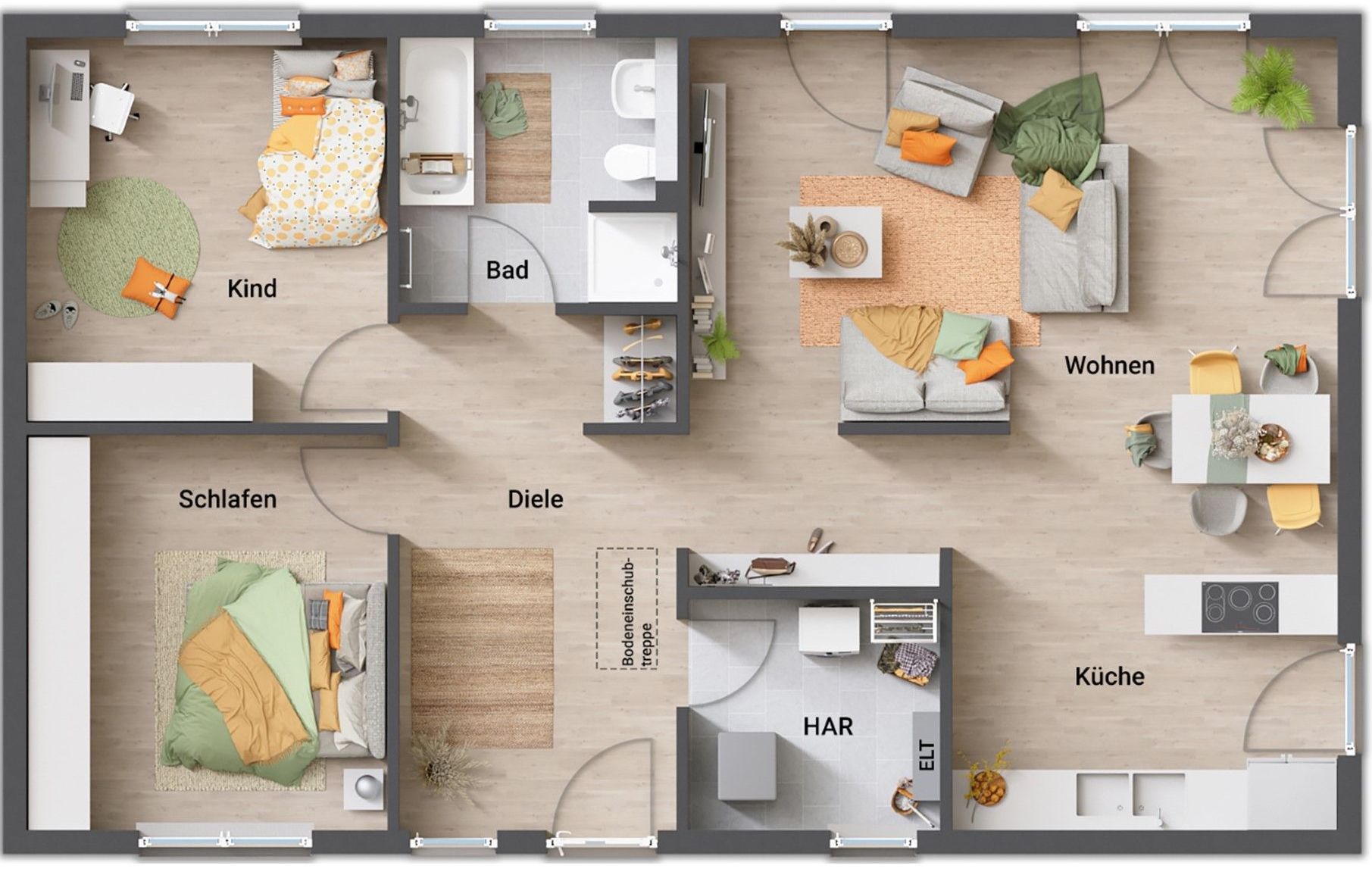 Der Bungalow 100 ist optimal für alle, die ein Haus fürs ganze Leben suchen. Mit rund 100 Quadratmetern Wohnfläche ist er nicht zu klein für eine junge Familie, aber auch nicht zu groß für ein Ehepaar im goldenen Alter.