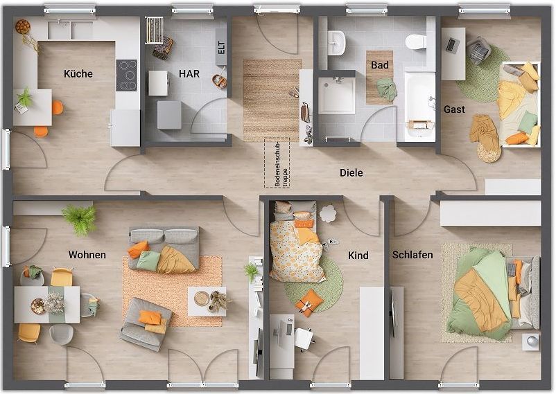 Für eine Familie mit zwei Kindern ist der Bungalow 110 ein ideales Zuhause. Er bietet ein gemütliches Wohnzimmer mit Essbereich, ein geräumiges Schlafzimmer und zwei weitere Zimmer. Alle Räume sind dank großer Fenster hell und freundlich. Mit quasi einem Schritt sind Sie mit Ihren Liebsten im Garten und können die Sommerzeit bei einem Grillabend genießen.