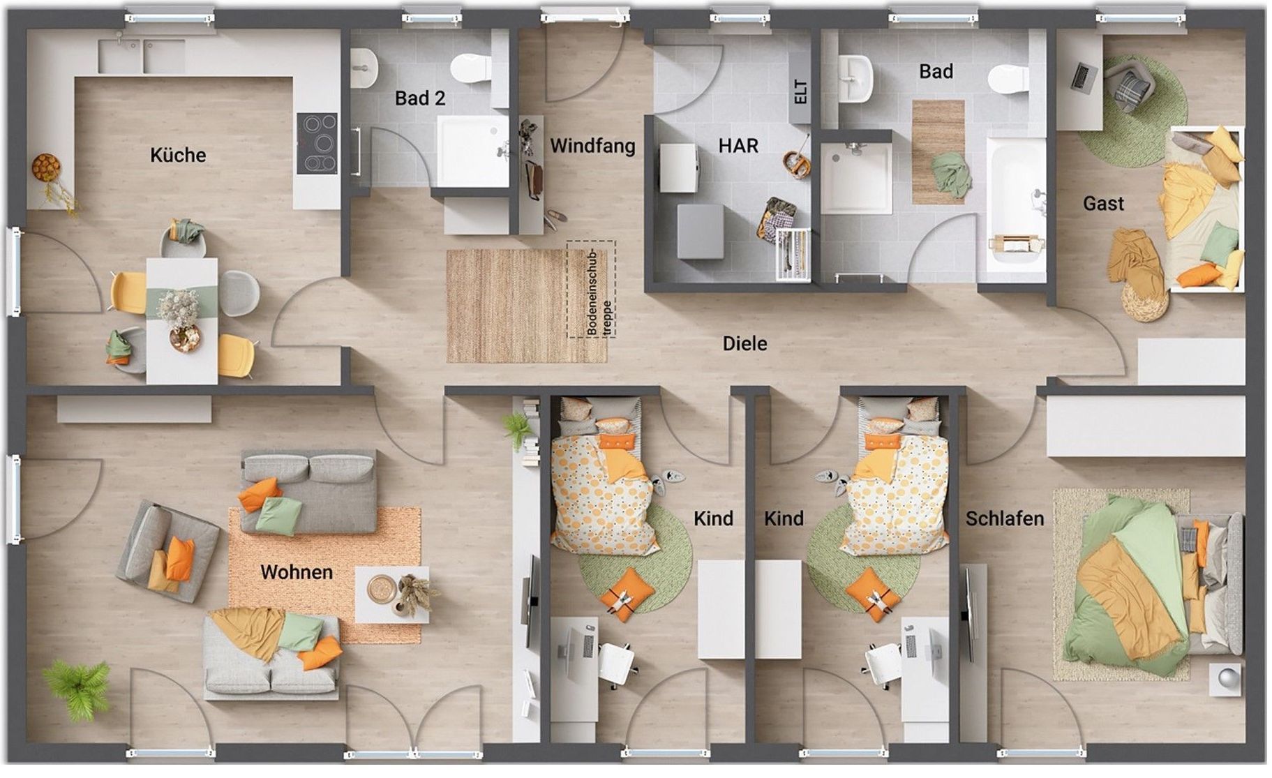 Der Bungalow 131 hat es in sich – 5 Zimmer, zwei Kinderzimmer und zwei Bäder – viel Wohnfläche und clever nutzbarer Stauraum für die ganze Familie. Die kluge Raumaufteilung bietet eine große Wohnküche in der Sie mit ihren Lieben Freizeit und Essen genießen können. Das traumhafte Wohnzimmer mit seinen großen Fenstern ist der perfekte Ort zum Entspannen, bietet freien Blick in Ihren Garten und mit wenigen Schritten sind Sie auf Ihrer Terrasse im Grünen.