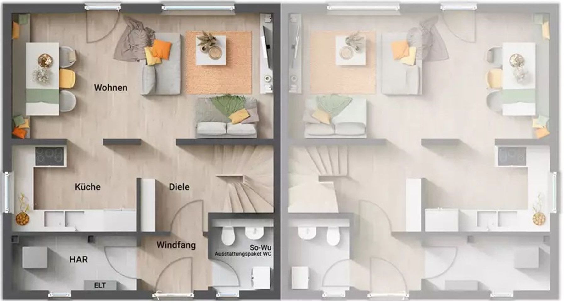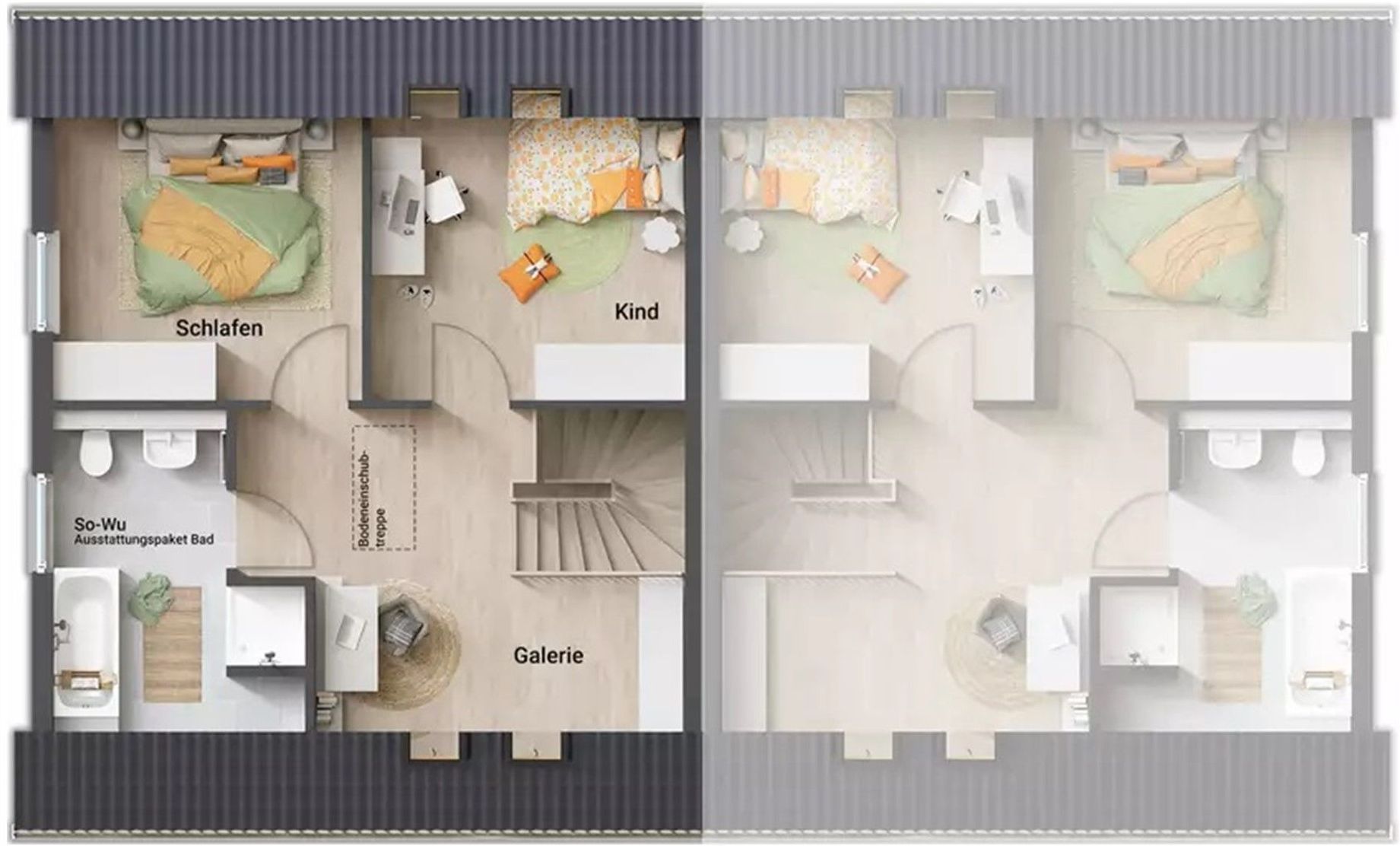 Dieses Haus ist ab 199.350 € zu haben. Der dargestellte Preis bezieht sich auf eine Doppelhaushälfte.