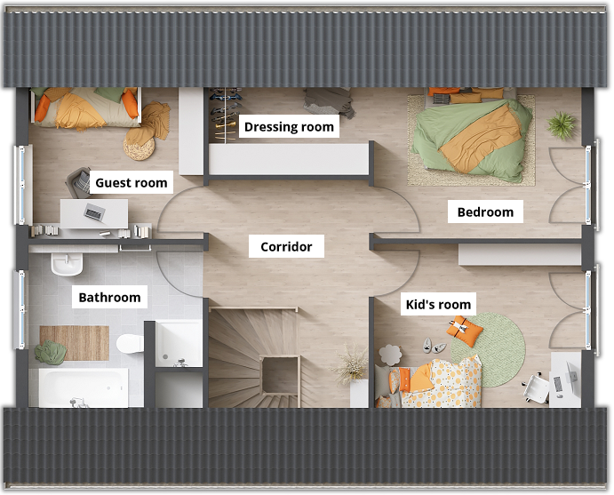 The spacious house with the beautiful gable roof impresses with plenty of space and a variable floor plan. The living room offers enough space for relaxation, the adjoining dining area quickly becomes a cozy family center with direct access to the kitchen. The high windows capture the daylight particularly well. Every room in the house appears open and friendly. A study or children's room and the guest toilet round off the ground floor perfectly.