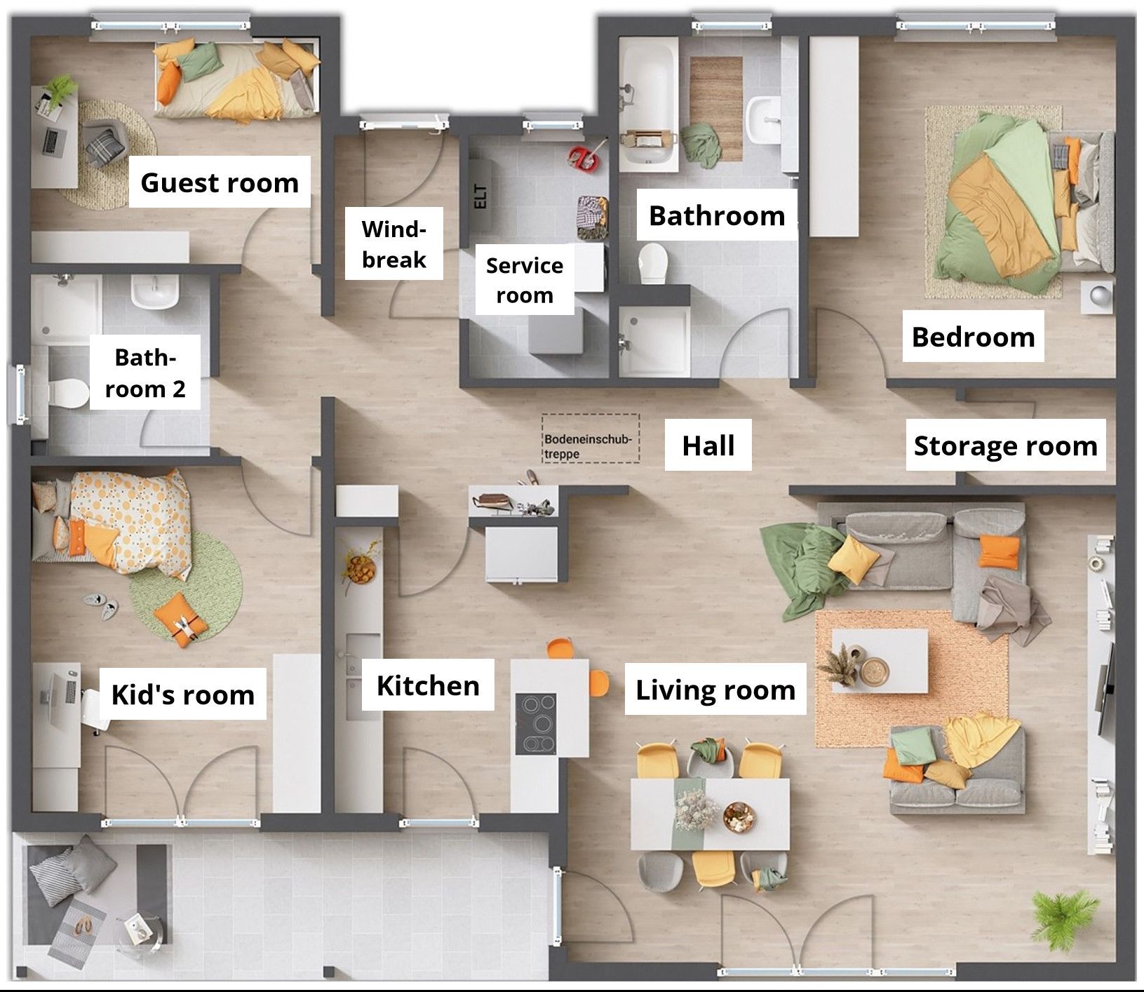 A bungalow that has it all - in the truest sense of the word: lots of space, no steps, two bathrooms and much more can be found in Bungalow 128. Thanks to the clever room layout, the area next to the entrance can be used as a separate apartment. Depending on your wishes or phase of life, you can use this as a separate work area or rent it out as an apartment with a separate entrance.