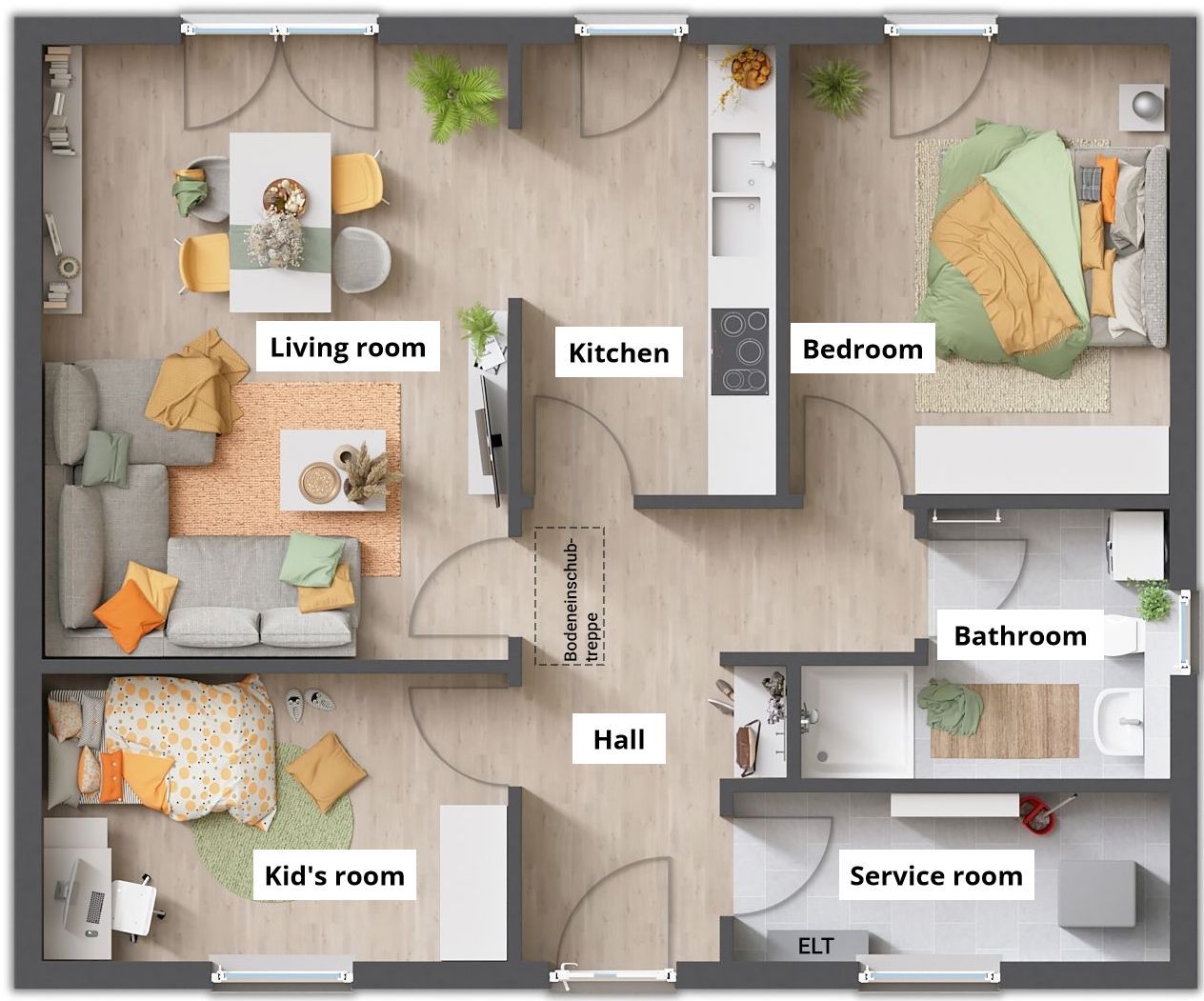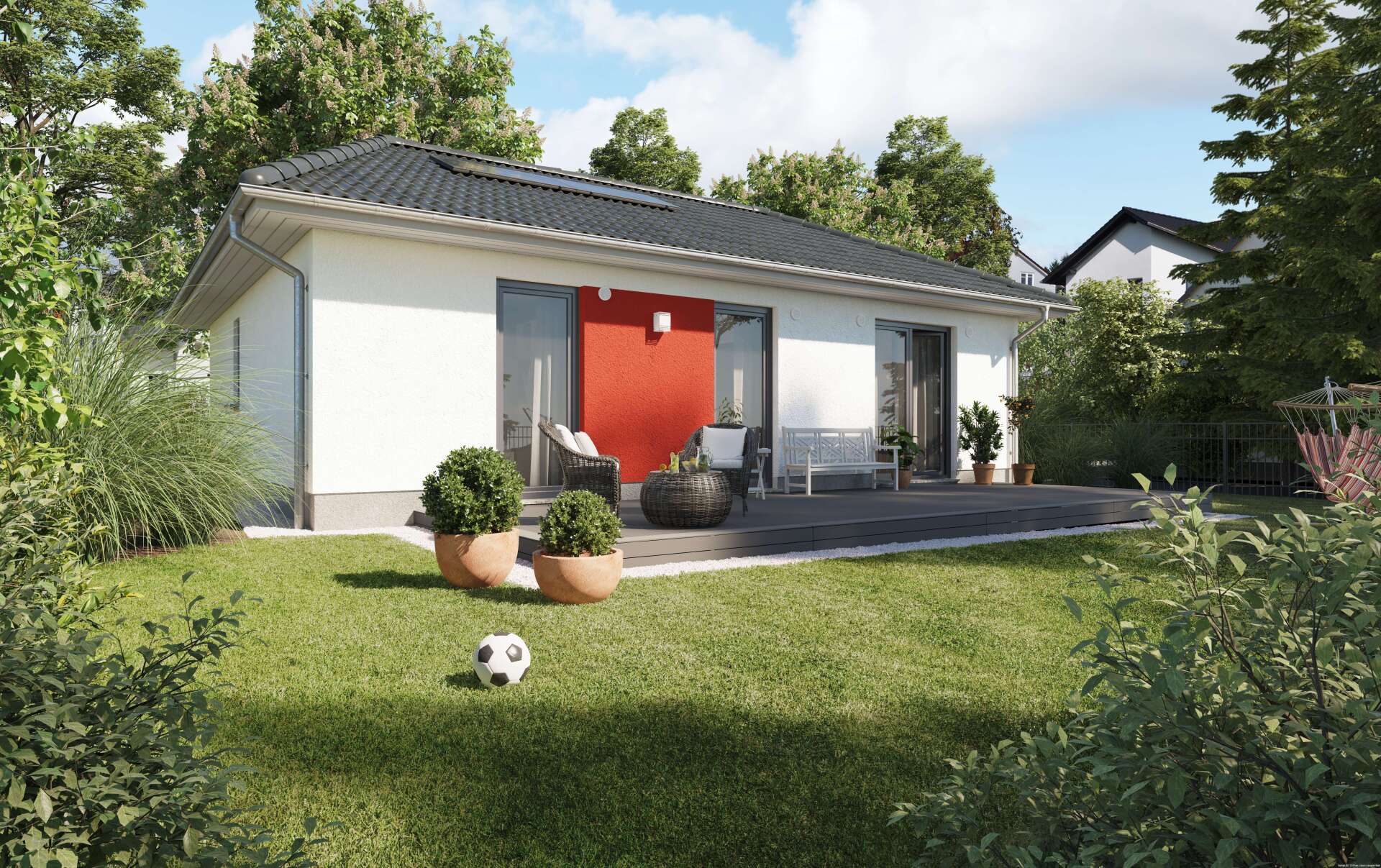 Thanks to clever planning, you will find enough space for the whole family on around 78 square meters. In the bright, spacious rooms you live on one level with nature. Whether living room, kitchen or bedroom – you are just one step away from your garden.