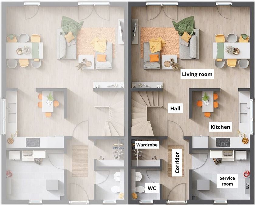 Here you can live and feel comfortable - in the Duett 125 semi detached house there is nothing missing! An open, bright living and dining area is the center of the house. The family meets here to have breakfast together or for cozy TV evenings. The spacious kitchen also has a small dining area from which you can watch while cooking. A highlight is the separate cloakroom area, which ensures order in the corridor.