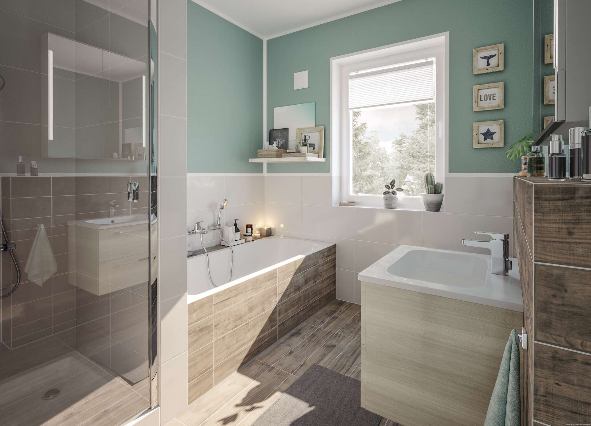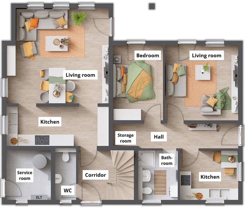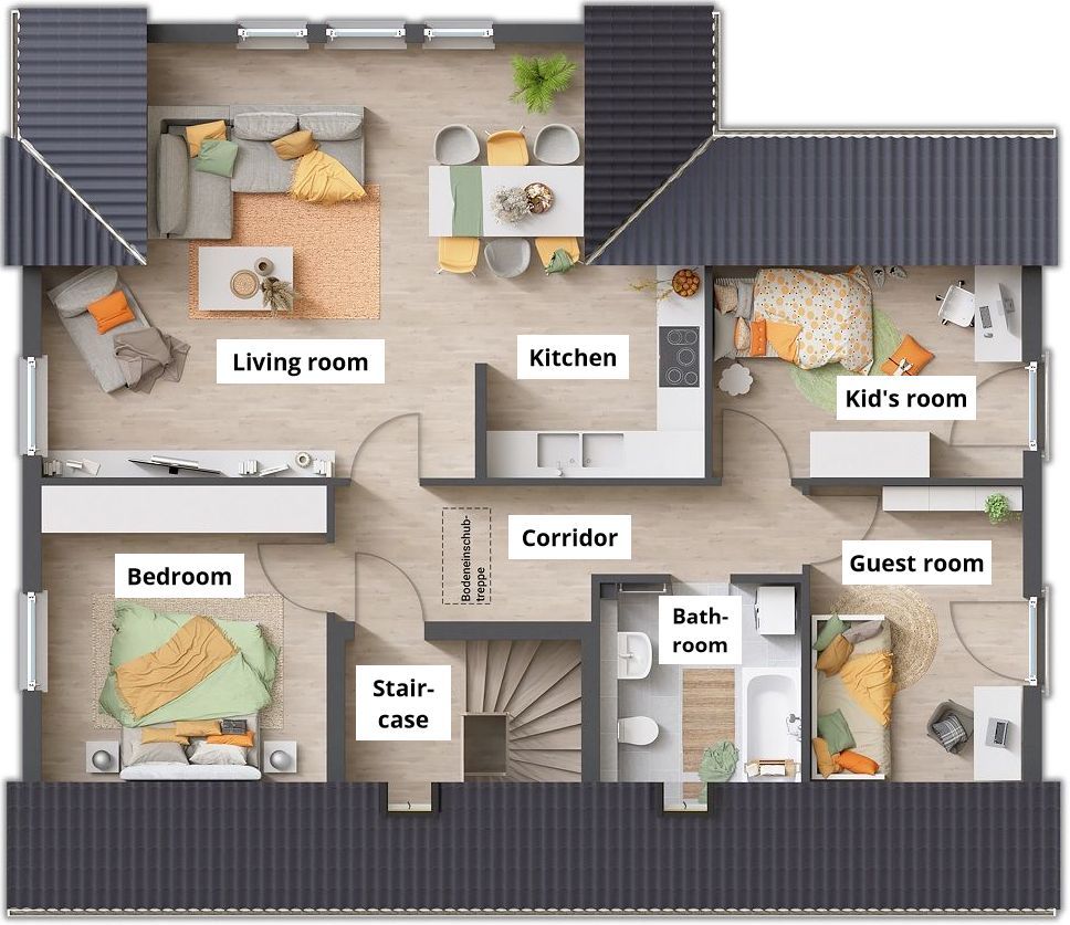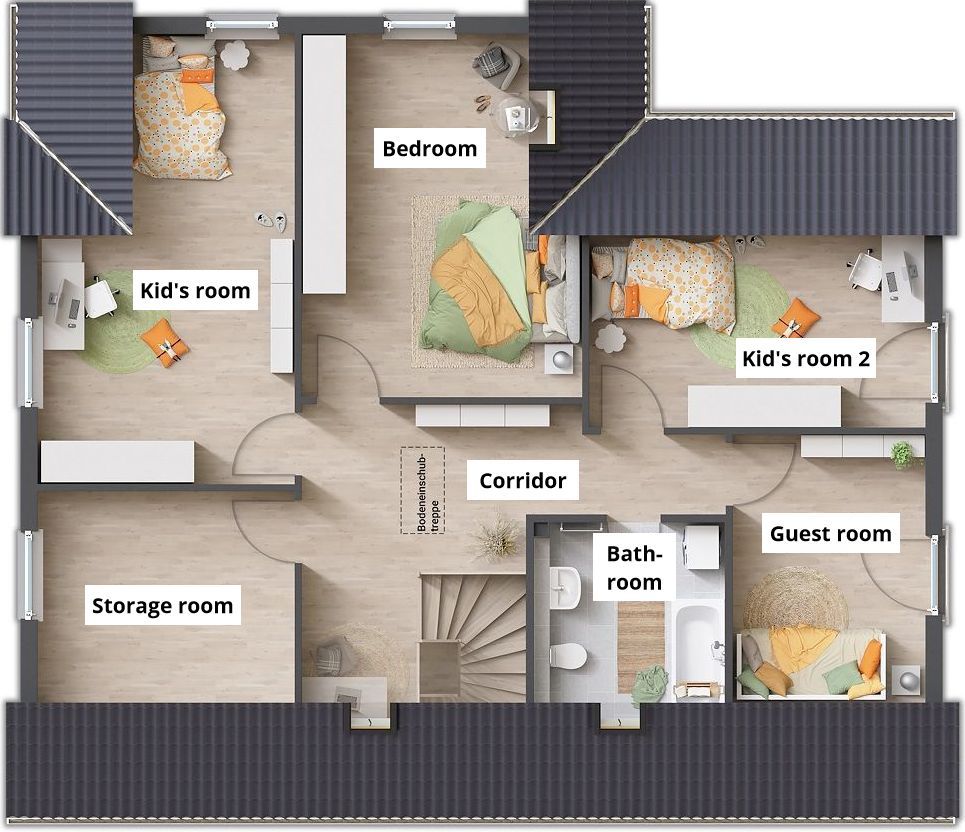 On the ground floor there is enough space for a large living room and bedroom as well as a children's room and guest room. From the living room you have a wonderful view of your garden through the floor-to-ceiling windows. You can also access this directly from your bedroom and guest room. The covered corner between the living room and guest room is particularly attractive on your way outside.