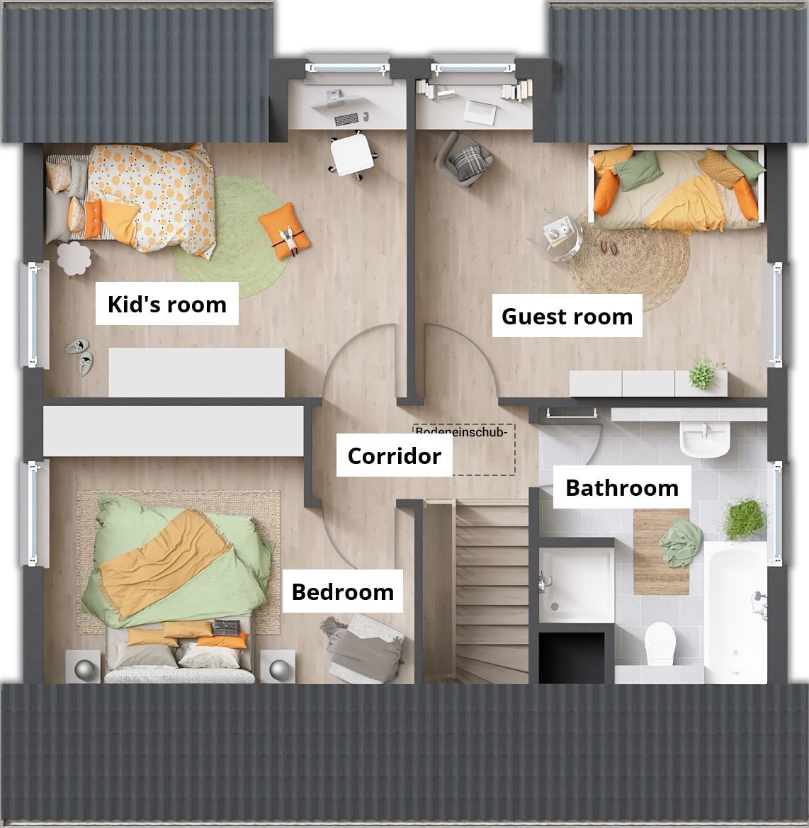 There is a cozy living atmosphere on both levels of the house and the rooms are pleasantly bright. Thanks to sophisticated planning, the Flair 113 is particularly flexible: the large living room can be easily divided into two rooms - thus gaining new space for a children's room, guest room or study . The Flair 113 is a variable family home that makes you feel good.