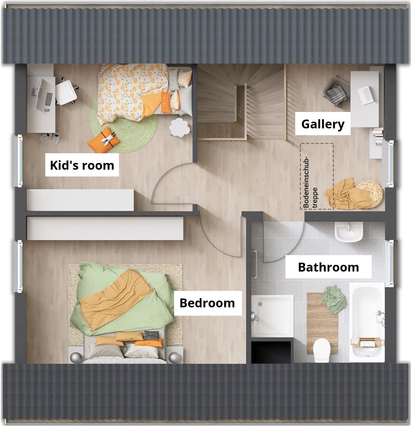 Unlike our turnkey solid houses, this house can be expanded, so you can save money through skilled craftsmanship in plumbing, laying tiles and installing interior doors. Thanks to an enlarged attic staircase in the gallery, the loft of our FürDich is prepared for expansion.