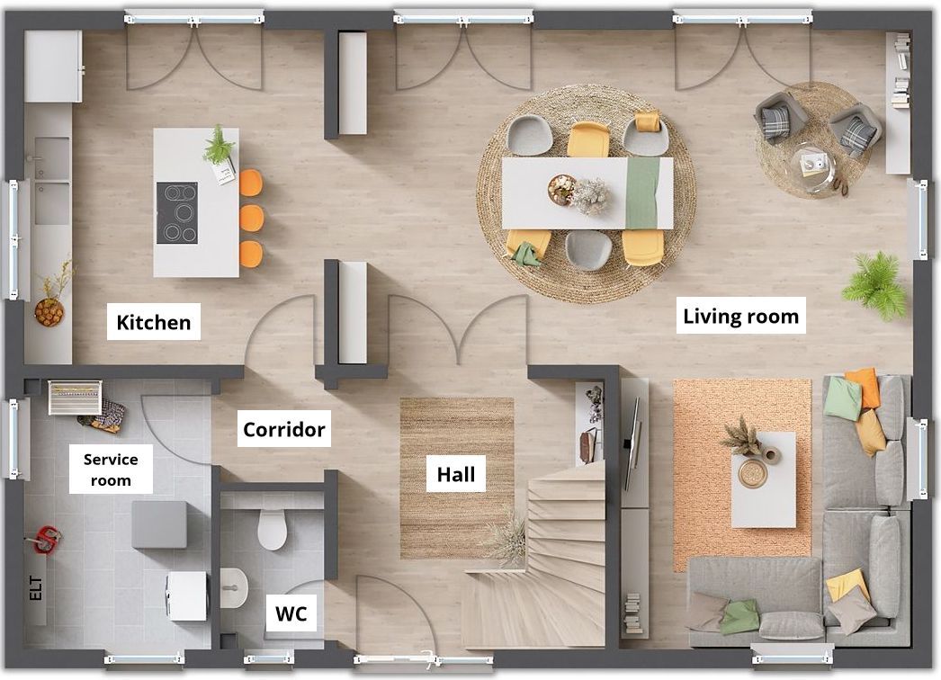 The country house 142 impresses with its rural flair as well as its timeless elegance. Everyone is guaranteed to find their place here. The spacious, light-flooded rooms on both levels are just waiting for your design ideas. The whole family meets in the kitchen for meals and the living room is also ideal for cozy hours or happy get-togethers.