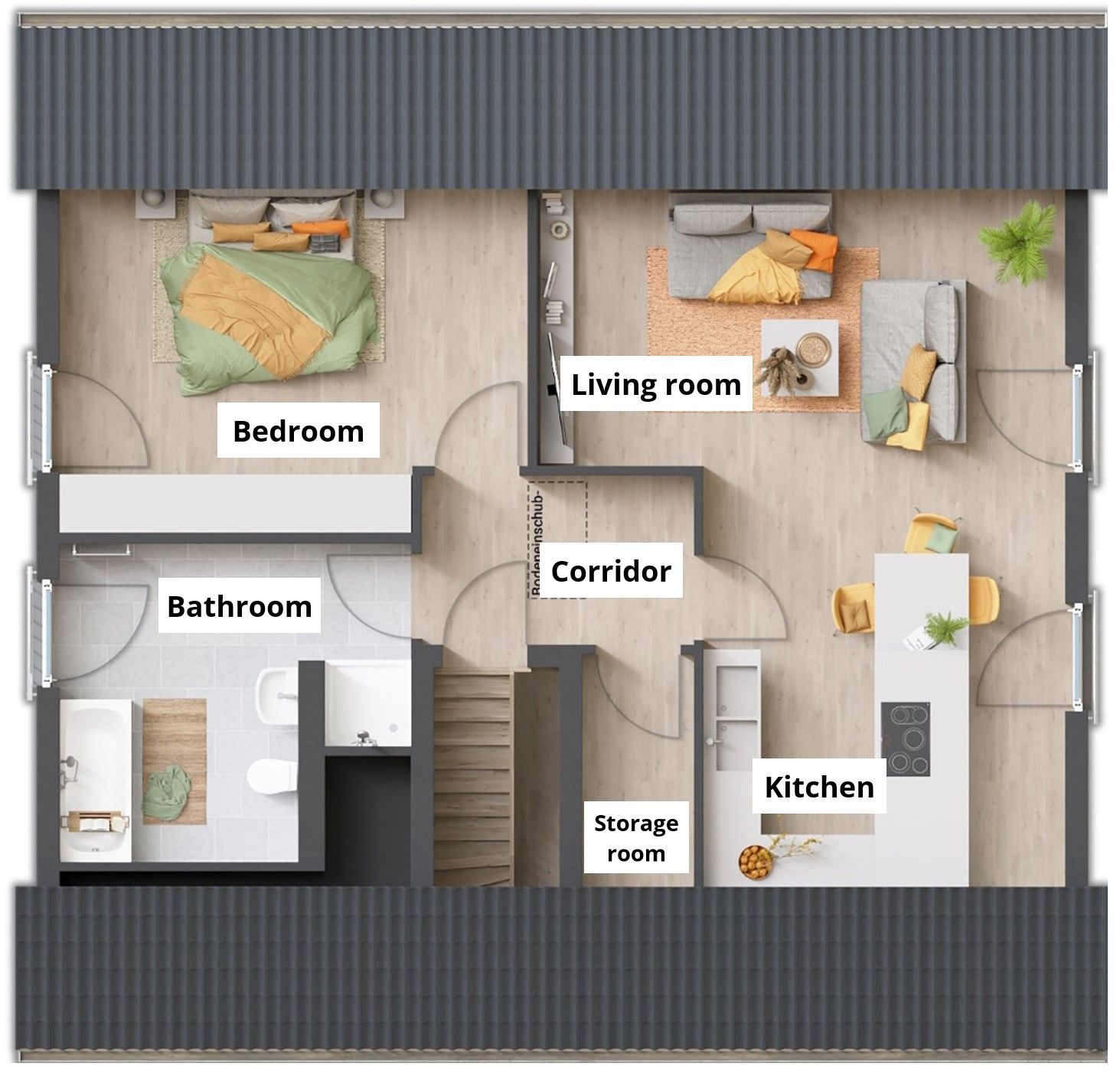 The open staircase takes you to the upper floor, where three spacious rooms await you. You can set up your little wellness oasis in the bathroom.