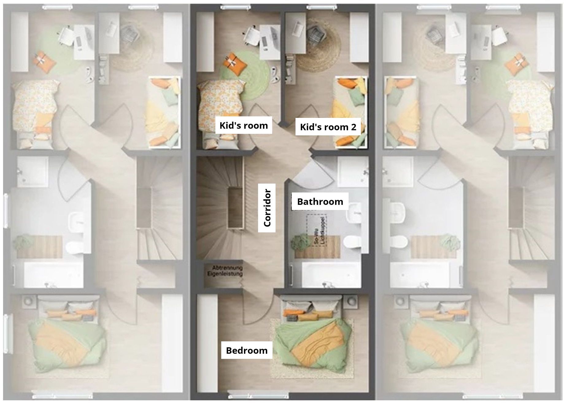 Thanks to the flexible floor plan, the terraced house can fulfill your dream of owning your own home! On the upper floor there is a retreat for young and old. Starting with two children's rooms, the spacious bedroom and the spa oasis. Take a look at the floor plans and create your massive dream home.