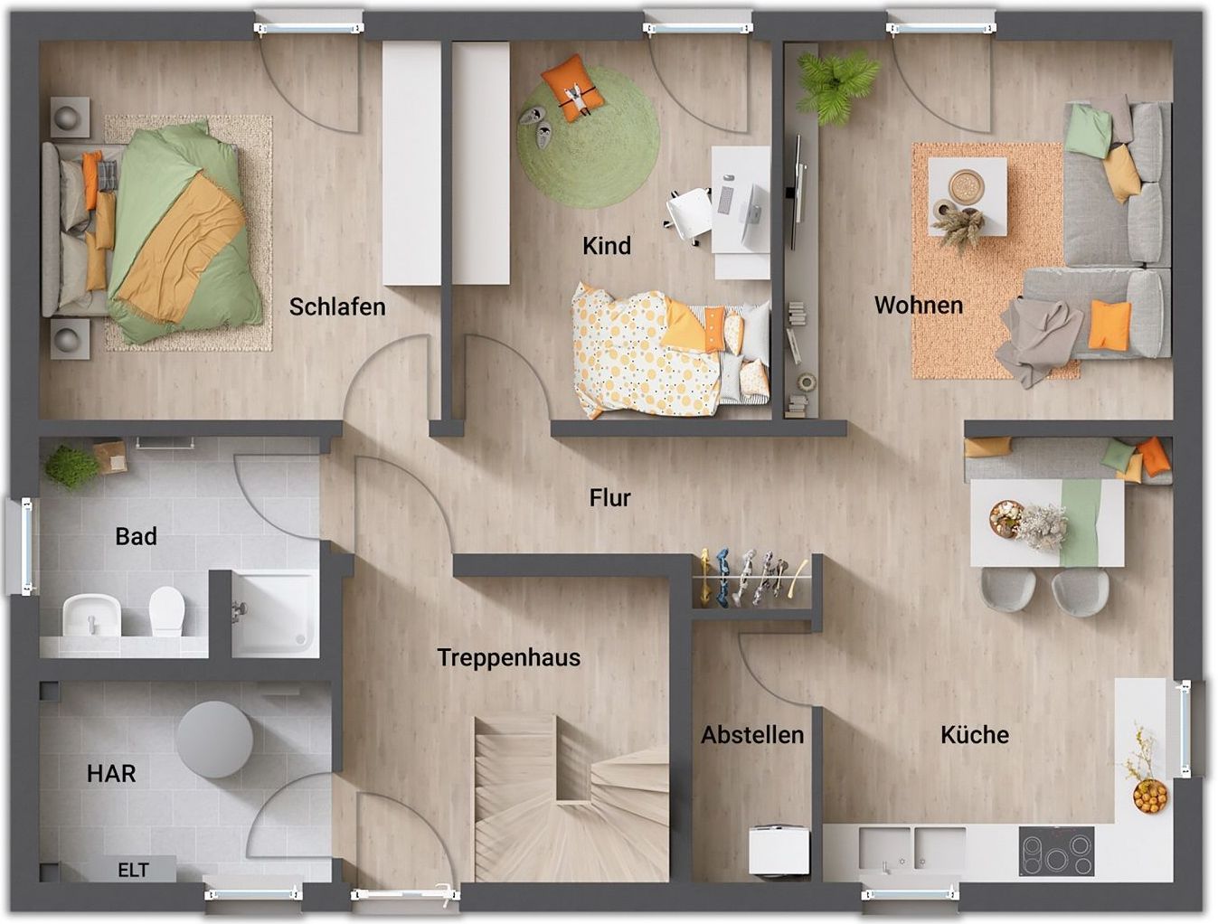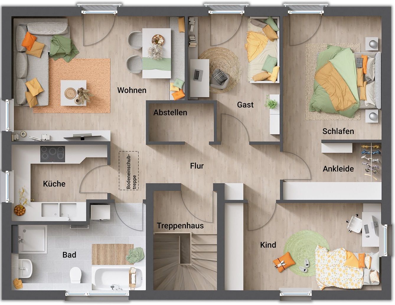 Auch im Obergeschoss wird moderner Wohnkomfort großgeschrieben. Während im geräumigen Wohnzimmer alle zusammenkommen, bieten drei weitere Zimmer einen individuellen Rückzugsort. Ausreichend Stauraum ist dank eines Abstellraums im Flur und einer Ankleide im Schlafzimmer gewährleistet.