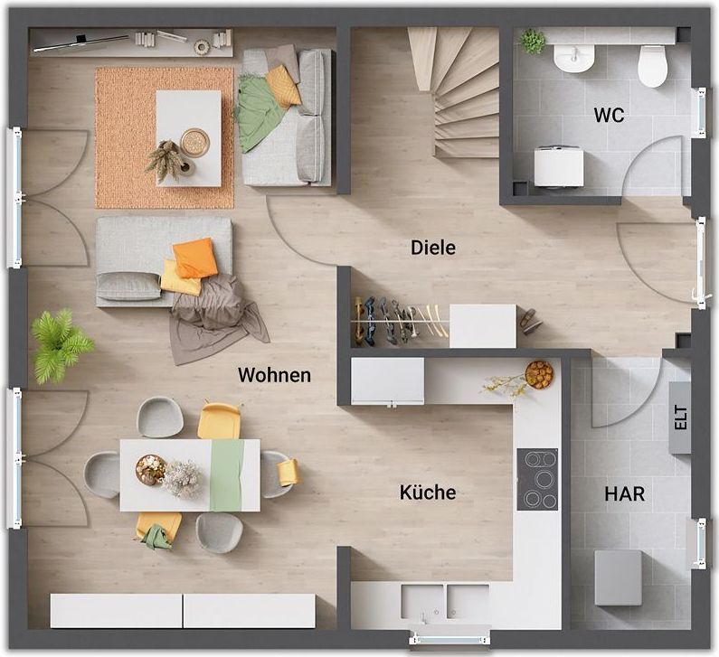Das Raumwunder 100 ist tatsächlich ein Wunder – auf nur 70 Quadratmetern Grundstücksfläche zaubert es ca. 100 Quadratmeter Wohnfläche. Wohnfläche, die sich sehen lassen kann: lichtdurchflutete, freundliche Zimmer verleihen dem Haus eine attraktive Wohnatmosphäre auf zwei Ebenen.