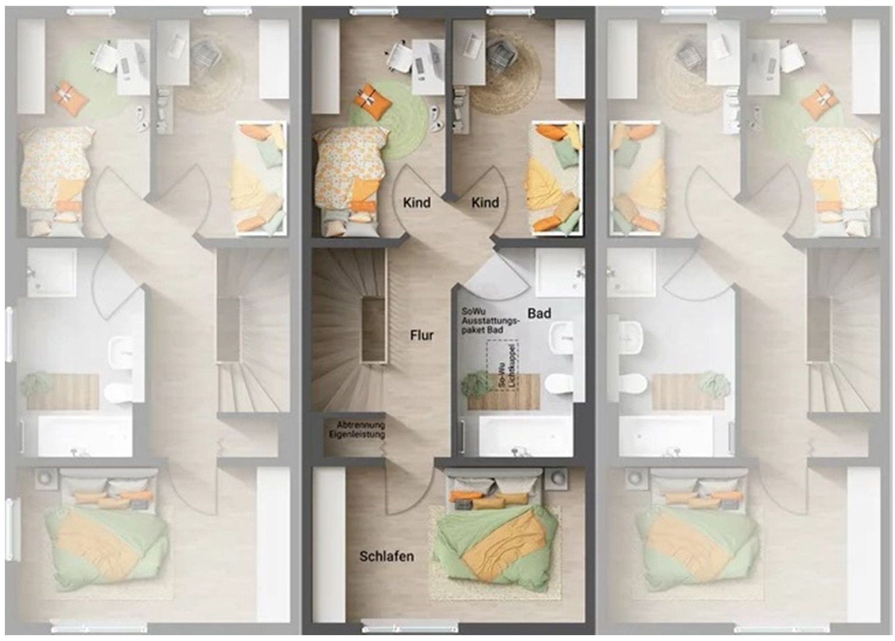 Dank dem flexiblen Grundriss kann das Reihenhaus Ihren Traum vom Eigenheim erfüllen! Im Obergeschoss ist der Rückzugsort für groß und klein. Angefangen bei zwei Kinderzimmern über das großzügige Schlafzimmer bis hin zur Spa-Oase. Werfen Sie einen Blick auf die Grundrisse und verwirklichen Sie Ihr massives Traumhaus.