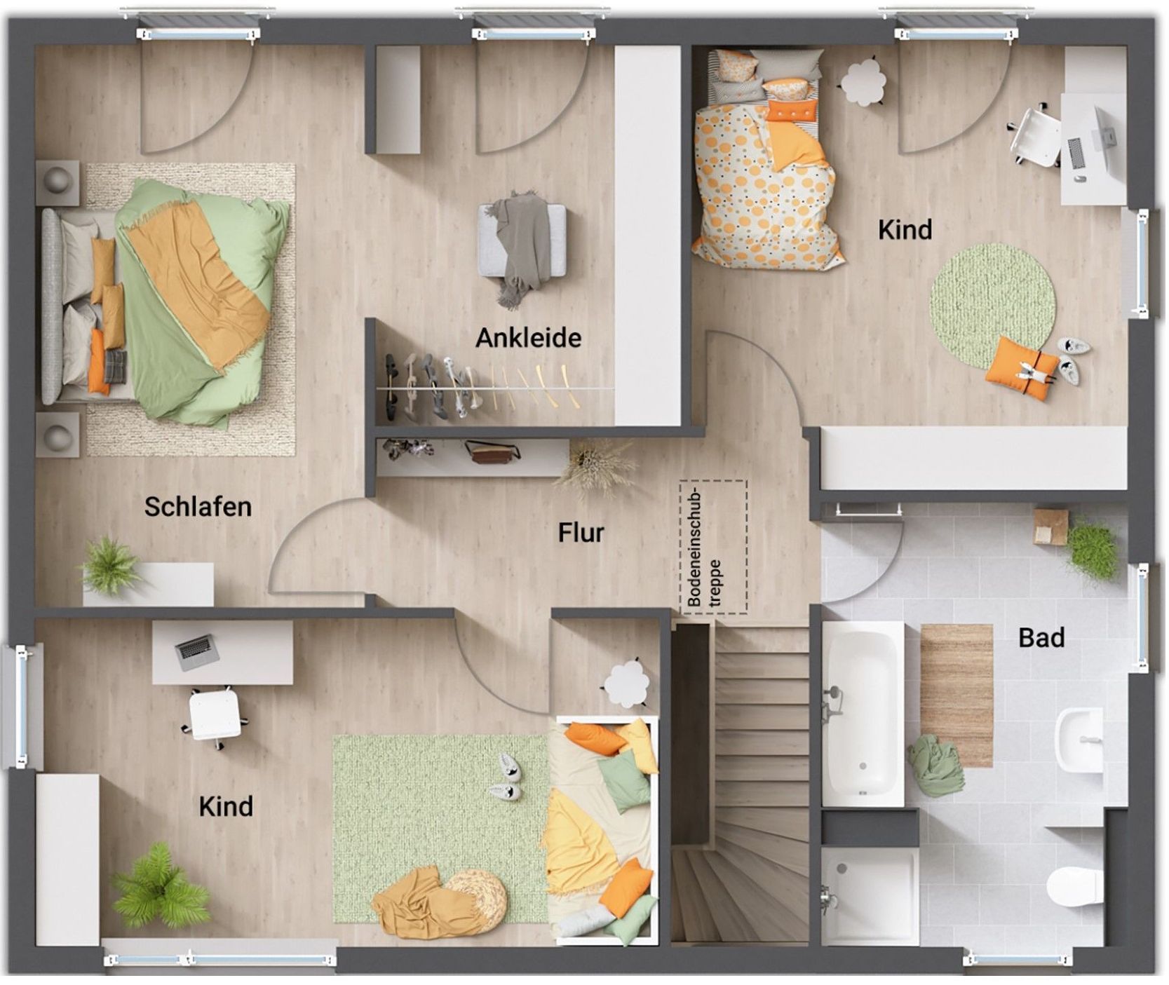 Auch das Obergeschoss zeigt sich im gradlinigen Baustil des Hauses. Hier finden Sie drei Zimmer, die Sie nach Ihren Vorstellungen als Schlaf-, Kinder- oder Gästezimmer nutzen können. Große Fenster lassen auch hier viel Tageslicht hineinströmen. Die Ankleide im Schlafzimmer bietet viel Stauraum.
