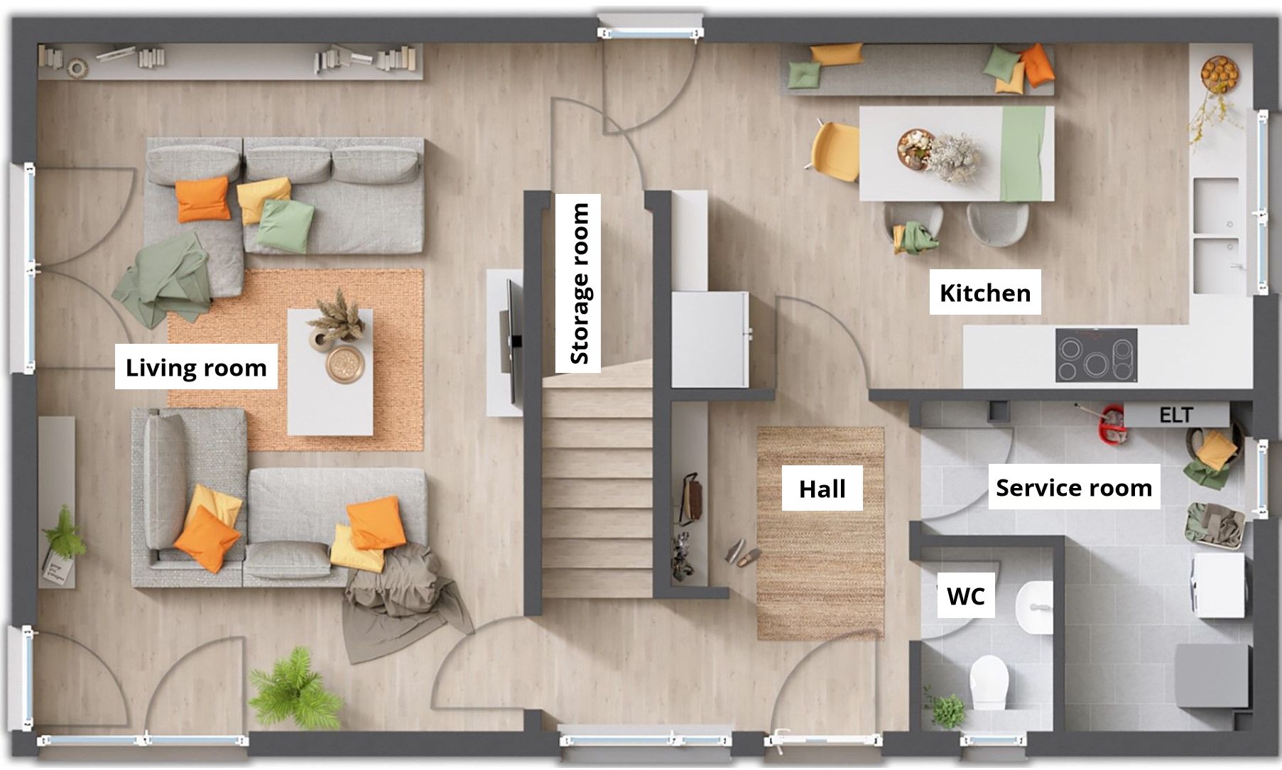 The touch of urban luxury is combined in the interior of the “Aura 136” with a modern and functional floor plan. The heart of the ground floor is not only the light-flooded living room, but also the cleverly designed hallway. From here you can access the living room, kitchen and guest toilet directly. Another highlight is the closed staircase. It offers space for your ideas, whether as a simple storage room, cozy reading corner or small work area.