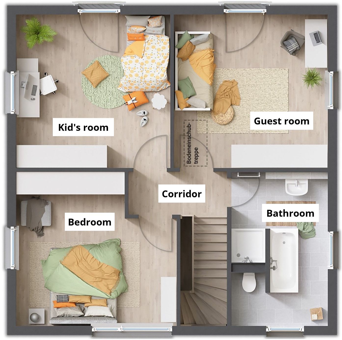 The attic also features the clear architectural style of the Flair 124. There are three rooms here that you can use as a bedroom, children's room, guest room or study. Thanks to large windows, all rooms appear bright and friendly.