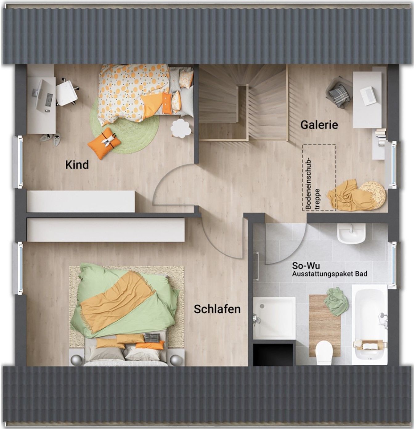 Im Erdgeschoss knüpft die offene Küche direkt an das Wohn-/Esszimmer an, während auf der Straßenseite ein Hauswirtschaftsraum und Gäste-WC Platz finden. Das Obergeschoss begrüßt dich mit einer Galerie für deine Hobbys oder deinen flexiblen Arbeitsbereich. Ein Bad, Kinder- und Schlafzimmer runden das Dachgeschoss ab.