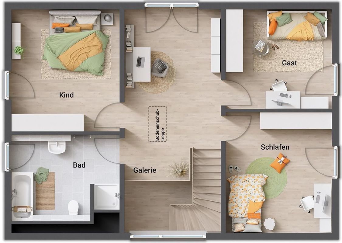 In der Küche ist Platz genug für eine gemütliche Essecke, ganz im Geist des bekannten Landhausstils. Die offen angelegte Treppe führt Sie ins Dachgeschoss, zu dem ein großes Schlafzimmer mit Ankleide gehört. Die beiden anderen Räume eignen sich optimal für Kinder-, Gäste- oder ein Arbeitszimmer. Das Landhaus 142 modern bietet ländliche Idylle im individuellen Stil.